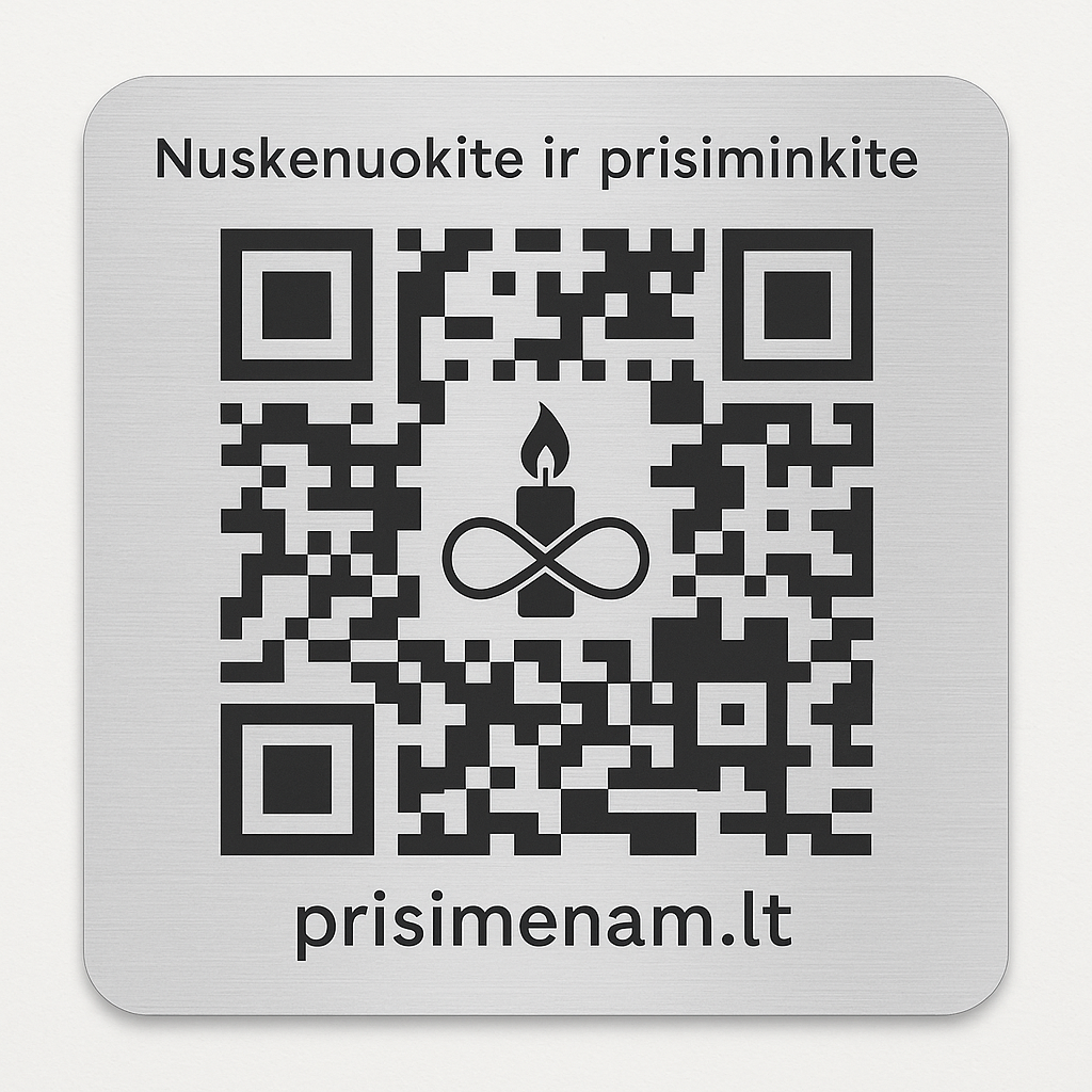 Skaitmeninis QR ir virtualus memorialo puslapis – be fizinės lentelės.